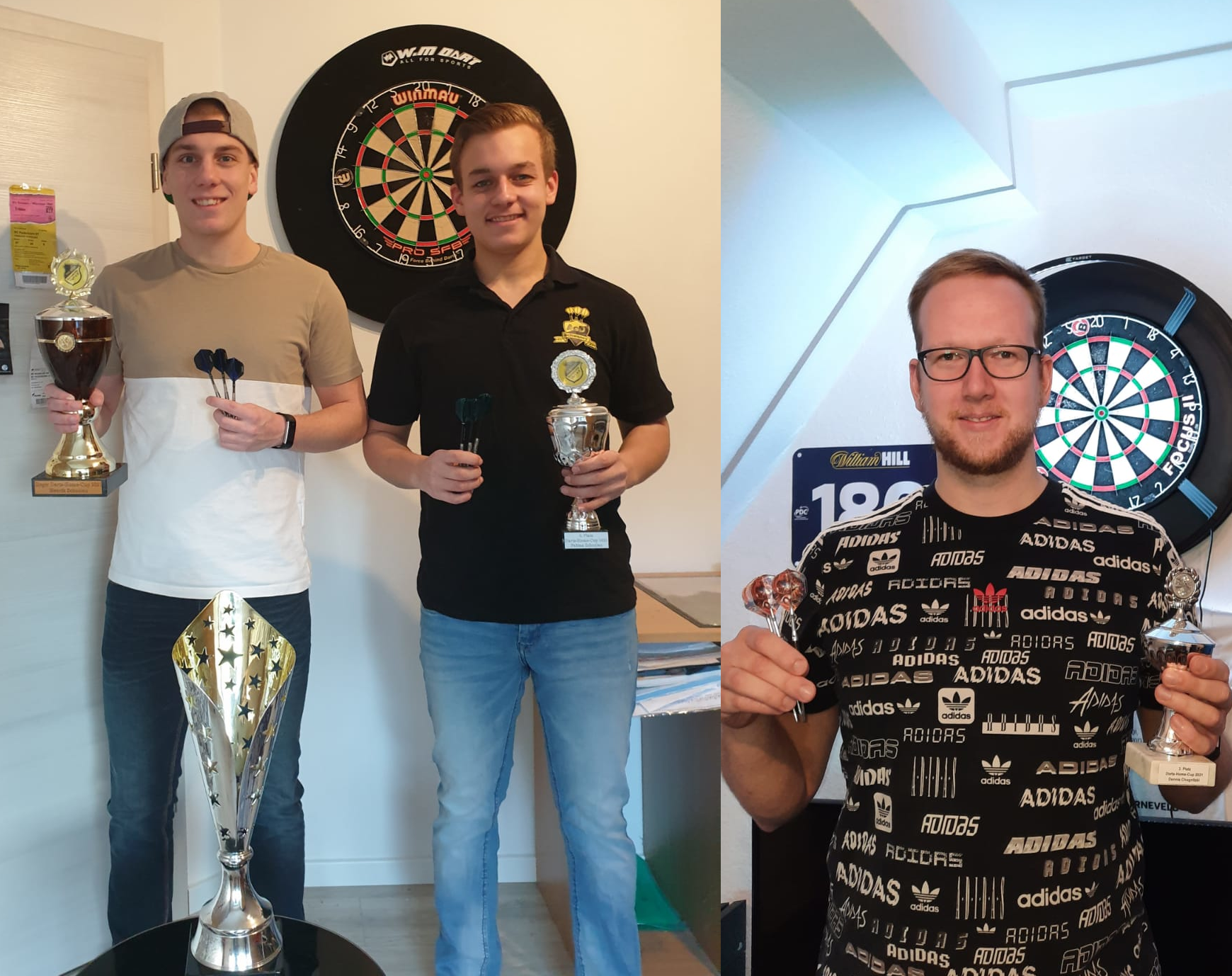 Der Gewinner des TuS Egge Darts-Home-Cup steht fest und heißt Henrik Schonlau. Bereits vor dem Finale war eines klar: Der Sieger kommt aus dem Hause Schonlau. Im Brüder-Duell siegte Henrik (links) gegen Fabian (mitte) mit 5:2. Im Spiel um Platz 3 behielt Dennis Chognitzki (rechts) mit 5:1 gegen Jonas Scholle die Oberhand.